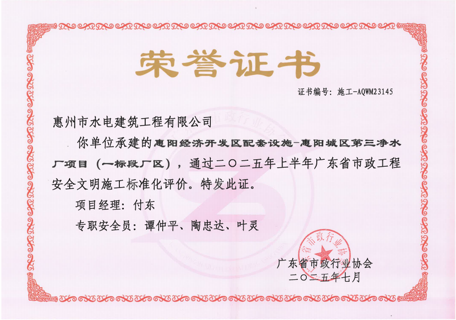 惠州市水電建筑工程有限公司成立于一九六四年四月,隸屬惠州市水務(wù)集團(tuán)有限公司,是一家國有綜合性施工企業(yè),主營水利水電工程、房屋建筑、市政工程等施工業(yè)務(wù)。公司擁有水利水電工程施工總承包一級、建筑工程施工總承包一級、市政公用工程施工總承包一級、公路工程施工總承包三級,公路路基、路面及建筑裝修裝飾專業(yè)承包二級,環(huán)保工程、機(jī)電安裝、河湖整治、輸變電工程專業(yè)承包三級等經(jīng)營資質(zhì)……