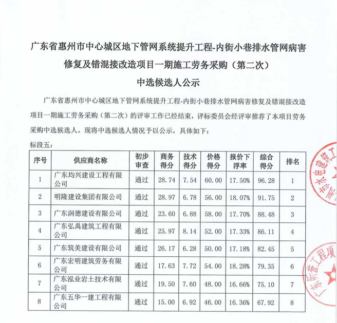 廣東省惠州市中心城區(qū)地下管網(wǎng)系統(tǒng)提升工程-內(nèi)街小巷排水管網(wǎng)病害修復(fù)及錯混接改造項目一期施工勞務(wù)采購(第二次)中選候選人公示……